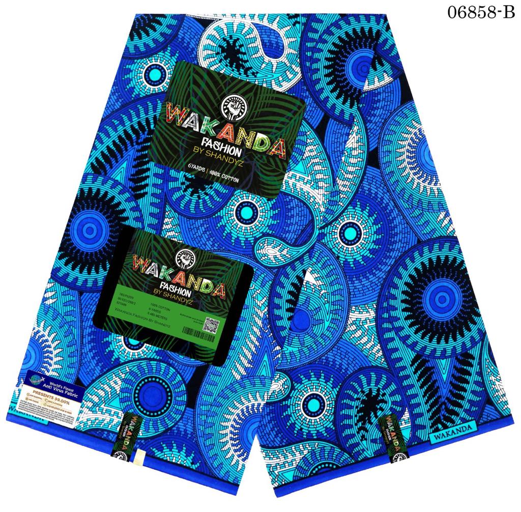 The design showcases a lively interplay of abstract patterns and shapes that symbolize the vibrant collaboration and expression within African communities. The deep blue tones dominate the fabric, representing the harmony and collective spirit that bring these communities together. This color evokes a sense of calm and unity, reflecting the seamless collaboration and shared joy of the people.